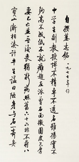 启功先生66岁小结人生时写《自撰墓志铭》:“中学生,副教授。博不精,专不透。名虽扬,实不够。高不成,低不就。瘫趋左,派曾右。面微圆,皮欠厚。妻已亡,并无后。丧犹新,病照旧。六十六,非不寿。八宝山,渐相凑。计平生,谥曰陋。身与名,一齐臭”,并幽默自谓“有化忧为喜的本事”,还想刻一方“一笑了之”的印章。