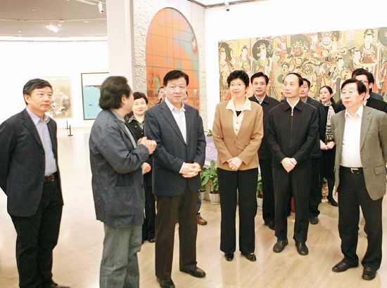 中国文联党组书记、副主席赵实,中宣部副部长翟卫华,北京市委常委、宣传部部长、副市长鲁炜,中国文联党组成员、副主席杨承志,文化部党组成员董伟,中国文联党组成员、书记处书记李前光,中国文联副主席、中国美协主席刘大为,中国美协分党组书记、驻会副主席吴长江等陪同参观。