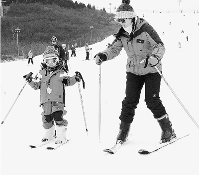 2月14日,一位小朋友在妈妈的陪伴下学习滑雪。当日是大年初五,许多市民来到北京万龙八易滑雪场,享受冰雪运动乐趣。记者 何俊昌摄