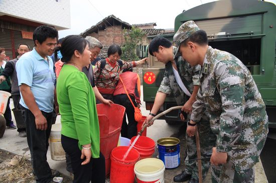 救援部队为受灾群众分水 雅安摄协刘南康摄