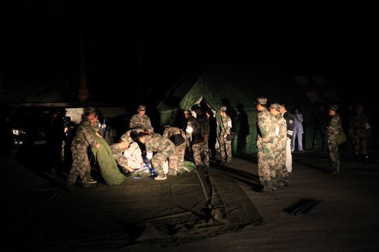 救援部队在搭建帐房 雅安摄协刘南康摄