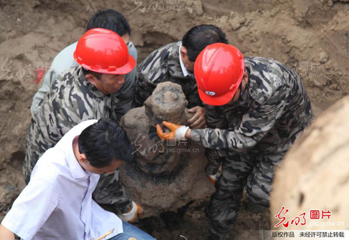 河北省沧州市海兴县一尊铁佛深埋地下67年,日前被当地政府文保部门进行发掘后,重新面世。铁佛高约70厘米,呈坐式。专家初步推断,铁佛铸造年代为宋代或更早时期,距今已有千年历史。1942年,铁佛所在的庙宇被改作学堂,孩子们经常在铁佛身上爬上爬下,佛体遭到破坏。为保护铁佛,1946年,东南村村民蔡玉池和家人将其掩埋在离观音庙庙门6米远的深坑里。今年4月初,海兴县文物部门找到蔡玉池指认铁佛埋藏地点,经过考古专家勘探,终于发现铁佛踪影。