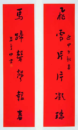 楹联从古代诗文辞赋中的对偶句逐渐演化发展而来,通过书写而成为独立的艺术形式,为历代书法家所热爱。在楹联的书写过程中,既有文学上的对仗和平仄的工整,又有书写上的对称和呼应的协调,其文学性和艺术性的结合,大大超过了文学与艺术本体的审美范畴。楹联在中国又是一种有着深厚群众基础和广泛应用的艺术形式,尤其是在春节期间,家家户户张贴春联,成为最具中国特色的节庆文化,而这之中一家老小以及亲朋好友拜年时对于春联的解读和欣赏,更成为一种文化的传承方式,基于此的对于美好生活的寄望和祝福,则在这一具有标识性的艺术形式中达到了文化与民俗的完美结合。