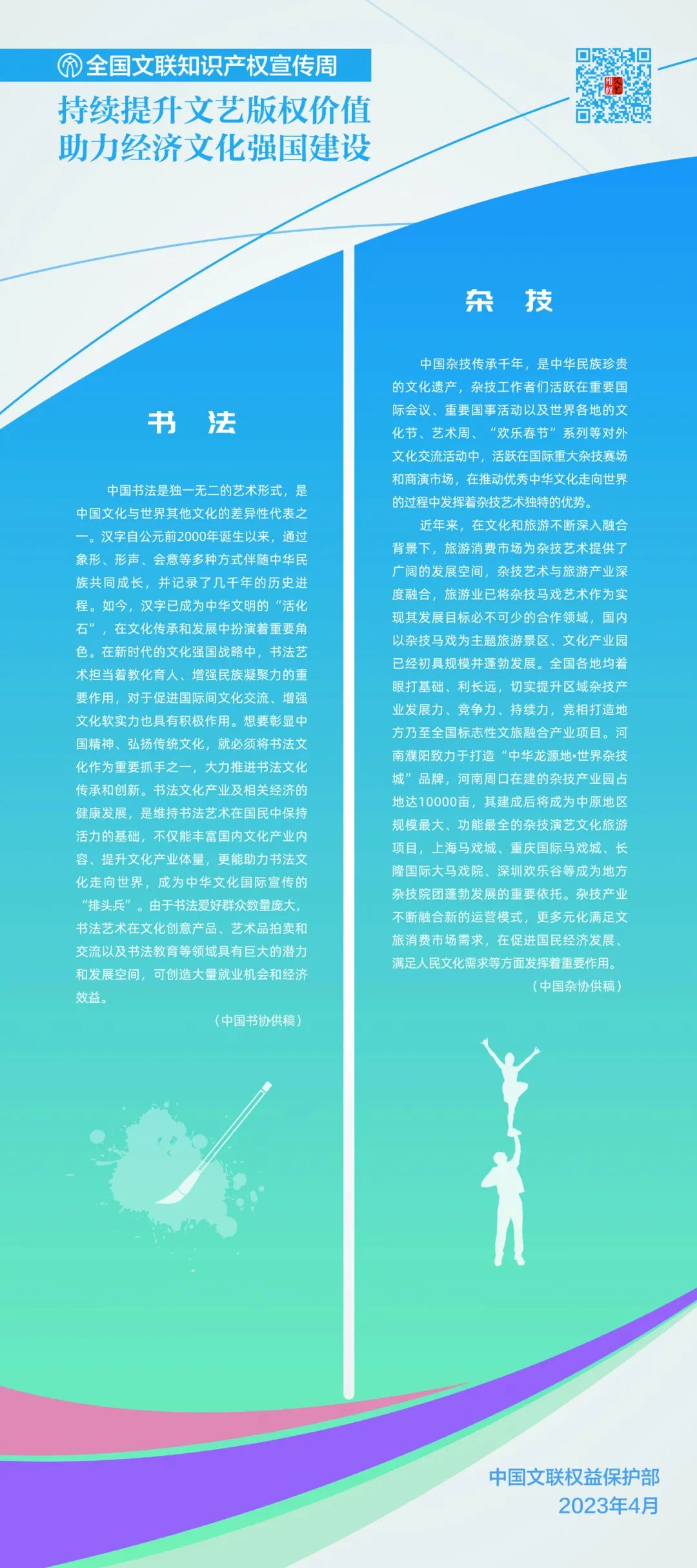 在第23个世界知识产权日来临之际,一年一度的“全国文联知识产权宣传周”活动将于2023年4月24日正式启动。为激励广大文艺工作者多出精品力作,深入发掘文艺作品版权的经济社会价值,助力经济、文化强国建设,本年度“全国文联知识产权宣传周”活动的主题定为“持续提升文艺版权价值 助力经济文化强国建设”。中国文联及其团体会员,包括11家全国文艺家协会和各省(区、市)文联组织将同期策划举办一系列知识产权普法宣传活动。
