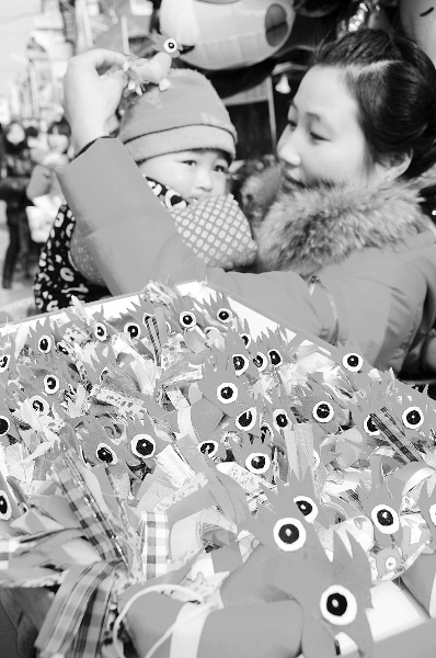 一月二十七日,一位女士在山东省临沂市郯城县马头镇集市上为孩子选购“春鸡”。随着“立春”临近,山东省临沂市郯城县的民间手工艺人忙着用彩色棉布和棉花缝制“春鸡”。据悉,鲁南地区农村有在“立春”之日把“春鸡”佩戴在孩子的帽子或袖子上的习俗,以此希望孩子在新的一年里丰衣足食、茁壮成长、吉祥平安。新华社记者 房德华 摄