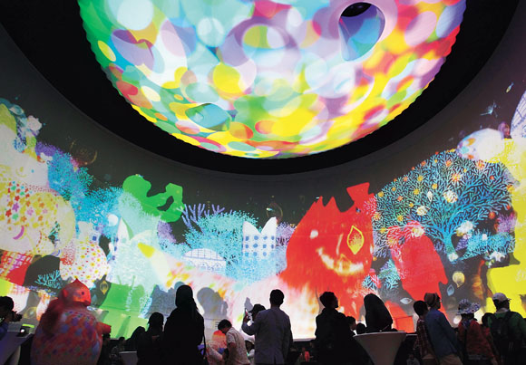 正在举行的韩国丽水世博会通过高科技手段将世博园区打造成“低碳绿色增长”的典范。图为近日在韩国丽水世博会的浦项制铁展馆内,参观者体验球形屏幕。参观者可以在舞台中央摆出各种姿势并通过屏幕看到自己舞动的身影。展馆内的球型屏幕以及互动的环节向参观者传达地球和人类和谐共存、相辅相生的理念。