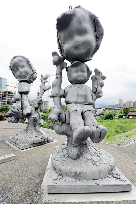 艺术与城市展览日前正在瑞士苏黎世举行。图为展出的美国艺术家保罗·麦卡锡的《苹果树男孩,苹果树女孩》(2010)雕塑作品。