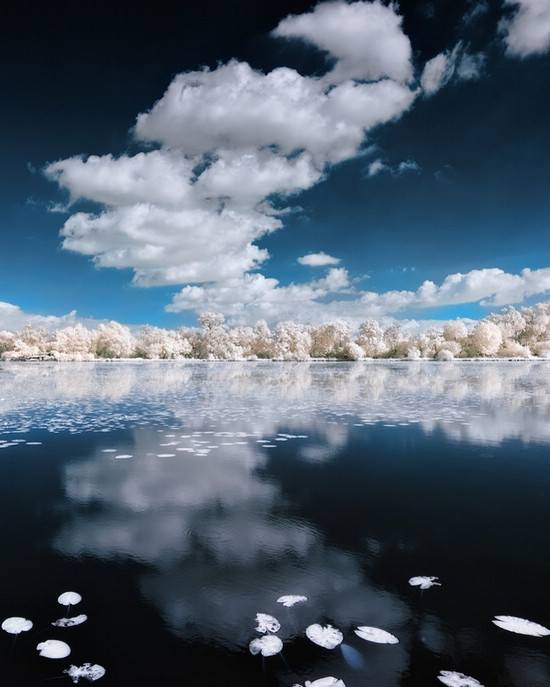 摄影师David Keochkerian的红外摄影中,自然景观中最熟悉的青葱翠绿不见了,取而代之的是一片斑斓。通过红外摄影技术的修改,天空和湖面在绚烂色彩的衬托下更显别出心裁。