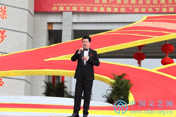 11月12日,为庆祝广西壮族自治区成立60周年,由中国文联、中共广西壮族自治区委员会宣传部、中国文艺志愿者协会主办,中国文联文艺志愿服务中心、广西壮族自治区文学艺术界联合会、中共崇左市委、崇左市人民政府承办的“情满八桂 筑梦广西”中国文联文艺志愿服务团“送欢乐下基层”走进崇左慰问演出在广西壮族自治区崇左市举行。图为崇左市人民政府市长何良军主持并宣布演出开始。 中国文艺网 白伟 摄