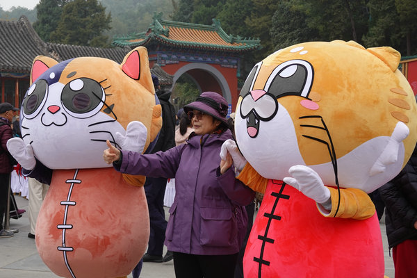 A senior takes a photo with costumed characters during the 38th Beijing Badachu Chongyang Mountain Festival, which opened on Wednesday.[Photo provided to chinadialy.com.cn]