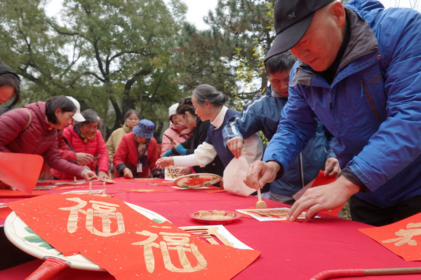 Seniors try interactive activities during the festival, including rubbings with golden powder.[Photo provided to chinadialy.com.cn]