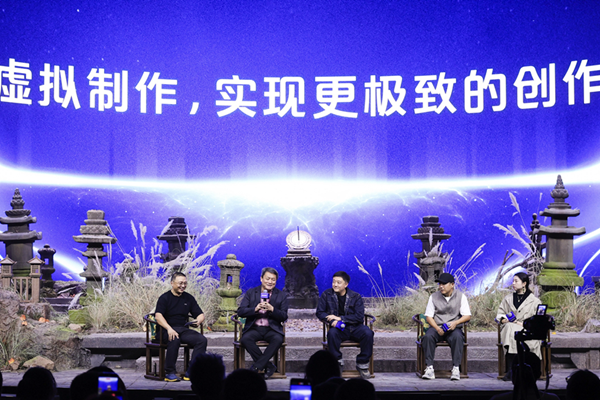 From left, Zhu Liang, Guo Jingyu, Zhang Jiyao, Du Lin and Ye Zi participate in a panel discussion on virtual production at an open day event for iQiyi's flagship virtual production stage during the Hengdian Film & TV Festival in Hengdian, Zhejiang province, Nov. 2, 2025. [Photo courtesy of iQiyi]