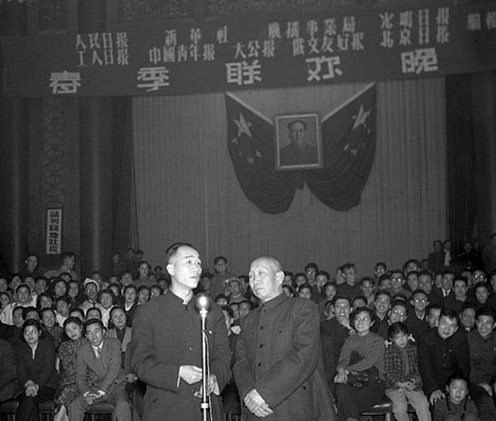1956年春节,《人民日报》、新华社、广播事业局、《光明日报》、《工人日报》、《中国青年报》、《大公报》、《俄文友好报》、《北京日报》编辑部联合举办联欢会。图为相声演员侯宝林、郭启儒在晚会上表演相声。
