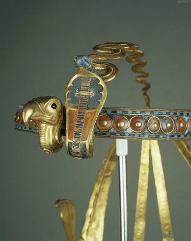 埃及法老图坦卡蒙的黄金王冠,装饰以抽象形式表达的眼睛蛇以及秃鹫,分别代表上埃及与下埃及的主神,古埃及文明,古埃及新王朝第18王朝