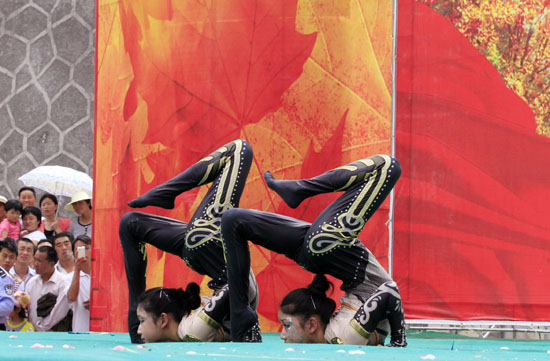 双胞胎姐妹石美茹、石美玉表演杂技《女子柔术》。中国文艺网 白伟 摄