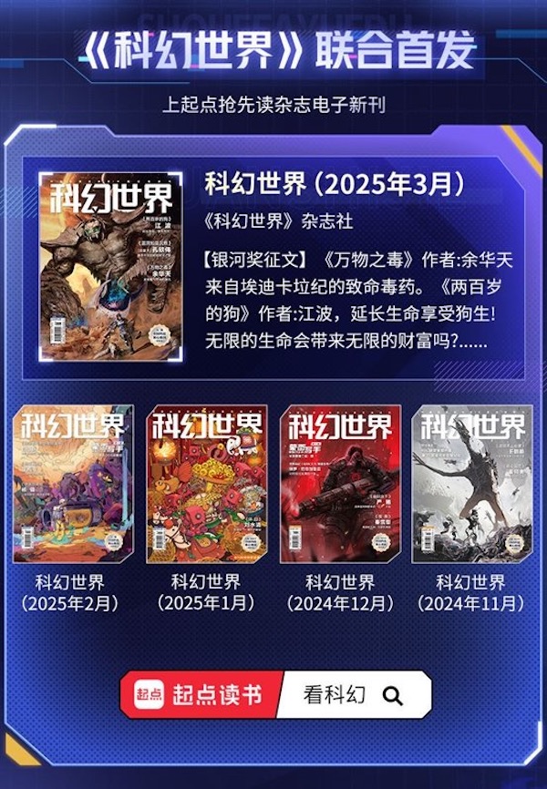 为持续激发科幻题材的创新力、影响力,日前起点读书还启动了科幻题材城市巡回征文活动。首期大赛落地深圳,以“突破想象的未来”为题,征集兼具科技内核与人文关怀的优质作品,用生动笔触勾勒科技创新的未来图景。