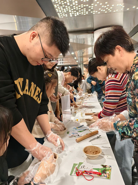非遗体验区人气爆棚,制香摊位前,读者们学习调配香料。剪纸、面塑、绳结、葫芦画、雕版印刷、榫卯结构等区域,读者们专注地跟着老师学习。红纸剪出灵动图案、面团捏出鲜活造型、彩绳编就传统挂件、木条拼成精巧模型,最热闹的糖画摊位,老师手中的糖浆蜿蜒流转,转瞬就凝成栩栩如生的小动物。