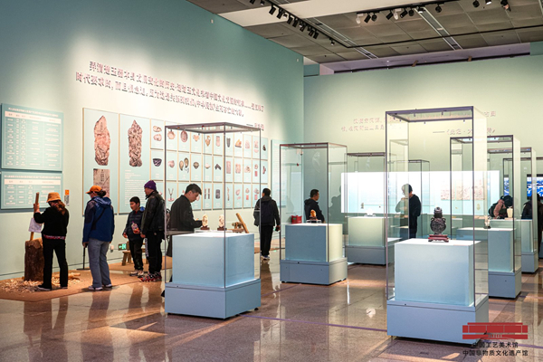 展览共设置昆仑神话、玉出昆冈、丝路名城、万方乐奏、百族骈阗、凝心铸魂六个单元,通过实物展陈、影像播放、技艺演示和互动体验等多种形式,系统呈现和田地区约30项国家级、自治区级非遗代表性项目,展品近600件,重点展出了艾德莱斯绸染织技艺、阿依旺营造技艺、地毯织造技艺、桑皮纸制作技艺等项目。展览不仅生动展现和田地区非遗的文脉传承、独特魅力与时代风采,也串联起和田地区乃至整个新疆的悠久历史和灿烂文化,更加描绘了新时代新疆各民族以饱满的精神风貌在中华民族大家庭中团结友爱,像石榴籽一样紧紧抱在一起、共建美好家园的壮美画卷。