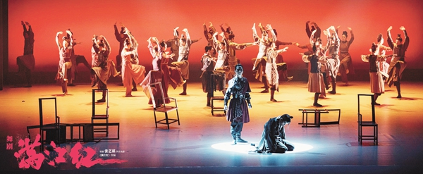 为6位主角设置心理角色,并以喻指秦桧的“邪恶之灵”和操纵孙均的“罪恶之手”的“黑鸟”贯穿全剧;以太师椅象征权力;援用“抢椅子”游戏演绎主角间的殊死较量;用“‘九鸟’撕绸”男子群舞表达女主人公殊死抗争所面对的强权恶势;用倒悬横立、肩撑手持残破的风波亭、月亮门、拴马桩、抱鼓石、隔扇门窗、枯枝败柳等物象来表现家国破碎、流离失所……舞台上,无论人物设置、动作语汇还是舞美道具等,意象性表达的写意创作手段俯拾皆是。“不讲故事”,即不着力于写实的悬疑叙事,让舞台呈现甚至舞蹈缝隙都在虚实相间中不断延展意义表达和戏剧张力。
