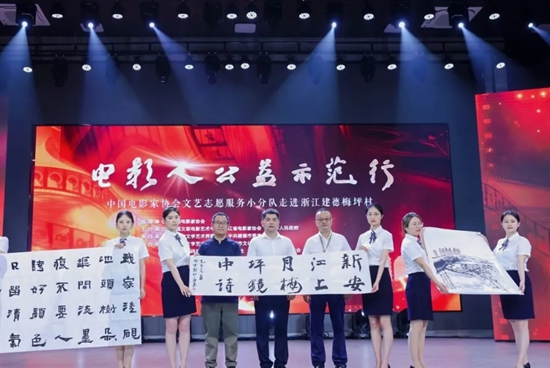 2025年,该活动先后走进江苏靖江、湖北宣恩和浙江建德,不断创新服务形式,形成了多层次、立体化的文化惠民体系:在湖北宣恩,举办公益放映,百花奖获奖影片《长津湖》引发观众对历史的深刻共鸣;在江苏靖江,革命题材电影《决胜时刻》的主创交流会上,导演宁海强、演员刘劲、刘之冰亲临现场分享创作感悟,让光影艺术与地方革命历史深度对话;文艺志愿小分队深入靖江新时代造船公司车间,为一线工人送去慰问演出与关怀;《大众电影》杂志社为梅坪村、桂花村等赠送《大众电影》杂志,让文化关怀直达一线。书画活动作为重要载体在2025年充分融入示范行活动——在宣恩县文化馆,艺术家们现场创作展现当地民族风情的作品;在浙江建德寿昌镇的书画笔会中,电影人与本地艺术家共同挥毫,创作出融合传统底蕴与时代风采的书画佳作。此外,“电影+文旅”交流座谈会汇聚多方智慧为宣恩文旅发展建言献策,而各地景区广场、乡村礼堂的慰问演出则点燃了基层群众的参与热情。