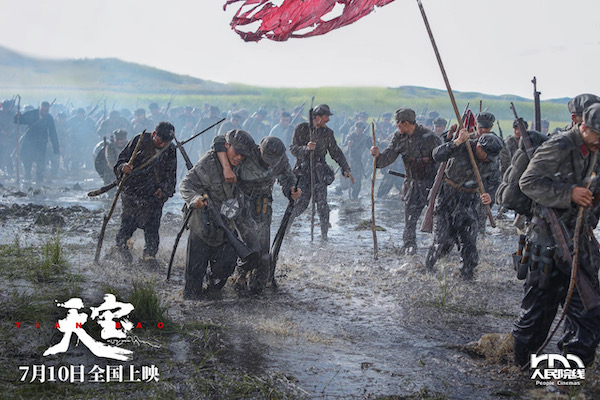 诗意表达则是体现在了影片的视听语言中,影片在影调设计上,天宝从少年、青年、暮年三个阶段分别采取“暗调、灰调、明调”三种影像风格进行区分,以视觉隐喻方式对人物身处时代的历史背景进行呼应。而天宝的多次回望,在后期剪辑时不断加入“闪回”镜头,这不仅表现的是他对人生的反观,更映照着中华民族共同体意识的觉醒,闪回过程中的人物局部特写与历史大场景来回切换,构建出独特的影像诗学。影片也特别通过声效设计来型塑情感,例如在表现红军过草地时的牺牲,设计了撕裂的布条随风飘动的声音,让人通过声音强化“虽看不到死亡,但死亡就在眼前”的感受,以唤起观众对前辈的怀念,这种声音设计具有强大的震撼力,深刻展现了为信仰而牺牲的伟大。影片虽然以战争年代为背景,但却对战争场面的直接展现并不频繁,更多的是通过细腻刻画人物的情感和动作来传达冲突与张力。同时,片中大量使用抒情音乐渲染氛围,辅以宁静优美的自然风光作为背景画面,实现了情与景的有机融合,从而赋予整部影片一种独特的气质与审美意境。
