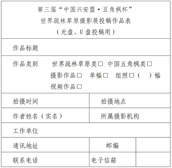1.摄影作品投稿地址:登录中国摄影家协会征稿平台zg.cpanet.cn,点击“第三届五角枫杯世界疏林草原摄影展”板块,注册并上传作品。主办单位保证不公开或泄露投稿个人非公开信息。投稿作品须为JPG格式,每张图片长边须为1000-3000像素,文件大小为2MB-7MB。投稿时必须填写完整作品标题、拍摄时间、地点、人物、事件以及简要说明,否则无法上传作品,凡因提交的个人信息不全面而影响联络者,视为自动放弃参展资格。所有投稿作品将自动存入中国摄影家协会图片库以备推荐给媒体、机构或平台选用;如有选用,中国摄影家协会旗下机构将按照《中华人民共和国著作权法》相关规定取得作者书面授权方可使用。无论投稿作品是否被授权存入中国摄影家协会图片库,均不影响投稿作品在本次大展中参展、入选。 2.视频作品可通过官方邮箱75811507@qq.com提交作品,同时提供投稿者资料及投稿作品表(word文档),建议上传最高格式压缩文件量1GB以内,分辨率1080P的MP4或MOV格式文件,并通过邮箱文件中转站上传。 3.光盘、U盘投稿:光盘、U盘包装盒上注明该展名称,每幅作品文件名处注明作品标题,同时提供作者资料及投稿作品表。投稿作品须为JPG格式,每张图片长边须大于1000-3000像素,大小为2MB-7MB。投稿时必须填写完整作品标题、拍摄时间、地点、人物、事件以及简要说明,否则无法上传作品,凡因提交的个人信息不全面而影响联络者,视为自动放弃参展资格。投稿作品以光盘(CD-R或DVD-R)、U盘存储形式邮寄至:北京市东城区东四十二条48号中国摄影报社活动项目部“第三届五角枫杯世界疏林草原摄影展”办公室收(100007)
