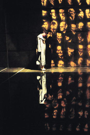 最后一幕茨威格自杀的桥段,舞台上没有正面表现枪声、流血和倒地,而是将一堵黑色的墙孤零零地留在舞台上,此处导演独具匠心地利用灯光将一些犹太人的面孔映射在墙面上,他们都是饱受战争摧残和种族歧视迫害的人们,他们的面孔枯瘦深陷,眼神惶恐仓皇,脸上布满了横竖的纹路,随着音乐愈加悲怆,他们的头像颜色也愈深,从最初的白色变成了怀旧的黄色,最终变成了血橙般刺目的颜色。