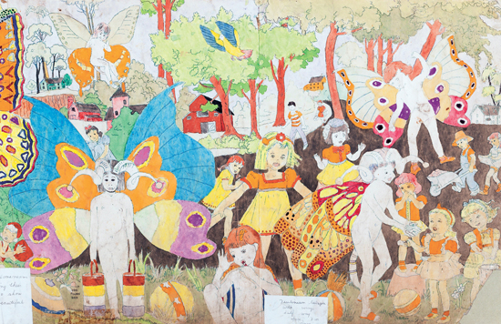 亨利·达格创作的24x109英寸双面全景作品,作品一面表现了画中的孩子们在杂耍滑稽演员的逗趣中快乐玩耍,另一面则展示了“扼杀孩子的男性形象”。(图片由柯蒂斯·卡特提供)