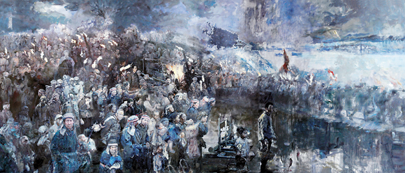 那是个星期天的早晨,当我又一次将画框抬起准备架到乳胶桶上时,由于角度太直,7米宽、3米高的画框晃动着、扭曲着,最后反扣着倒向地面。天哪!地面上散落着调色板、箱子、刮刀、画笔、擦笔纸,而那颜料未干的画面!这刻画细致的人物!……我用肩膀扛着底部的边框,用余光搜寻调色板的位置,摸索着抓住然后用力地将它扔出去,用脚钩出小木箱,将倒扣着的画框慢慢地架在木箱和乳胶桶上,然后趴在地上窥视画面。谢天谢地,除了局部粘了一些杂物外,整体画面并没有被破坏。我将画框的底部放回地面,将画框的顶部架在两个梯子上,左右抬升,当升到一定高度的时候,再用力地从中间的木框上往前推,画又立起来啦!此时的我已大汗淋漓、气喘吁吁。