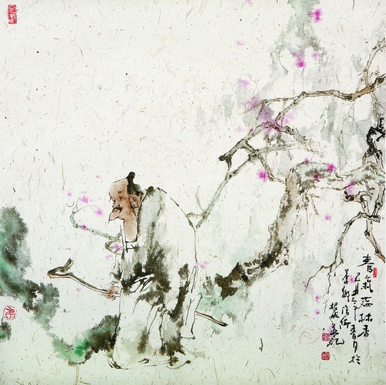艺术家的创作活动是按照美的规律进行的,只有与美相结合,才能产生真正的艺术,这就必然打破或改变客观生活与事物固有的常态和现状,以新的面貌呈现在观众面前。显然,画家偏重于个性创造性的发挥,这一个性反映了画家对客观存在的体验与感受,是情景交汇,是内心情感的抒发。有的是直接感受,如《农家乐》,有的是间接感受,如《艰苦岁月》。赵根成的另一些工笔画作品,如以表现农家生活情趣为主题的《妮子》,为“红小鬼”造像的《流金岁月》以及表现历史人物的《东坡品茗图》《经商鼻祖》和佛教人物的《罗汉图》等作品,都是根据直接或间接的生活经验,按照自己对生活的认识、理解与评价进行绘画和构思创作的,画家的思想感情、生活经历、文化修养、美学情感、个性禀赋、性格特征等必然溶解、渗透在作品中,所以就产生不可避免的“似与不似之间”的多种不同。其实,现代的几位艺术大师黄宾虹、齐白石、潘天寿、傅抱石、黄胄等各自不同的艺术手法,已为我们树立了典范。