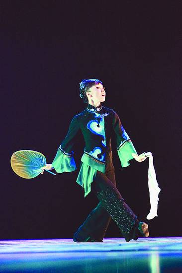 曾荣获第七届全国“桃李杯”舞蹈比赛中国民族民间舞少年甲组表演一等奖、第三届CCTV电视舞蹈大赛中国民族民间舞组表演金奖、第八届全国“桃李杯”舞蹈比赛中国民族民间舞A级青年组表演一等奖、第三届首尔国际舞蹈比赛民族舞青年组表演金奖的军艺优秀毕业学员玉米提,为大家带来了一支表现少数民族独特风情和幸福生活面貌的《盘子舞》。为把最原汁原味、最具原生态的元素展现出来,他一登场,便用激情似火的肢体、英气逼人的眼神、舞动盘子的各式民间技艺,以及那一连20多个低空跪转起落的高难技巧,把维吾尔族青年的形象塑造得阳光灿烂,赢得了全场观众的热烈掌声。