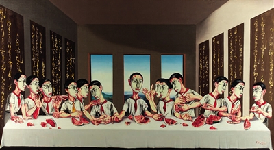 《最后的晚餐》创作于2001年,是曾梵志《面具》系列中尺幅最大的作品。