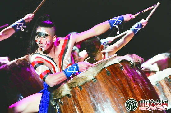 12月4日晚,在云南临沧市举行的云南省第八届民族民间歌舞乐展演活动中,一批少数民族原生态歌舞乐节目亮相舞台。图为来自云南民族村的佤族小伙子展示传统舞技《天地人鼓》。