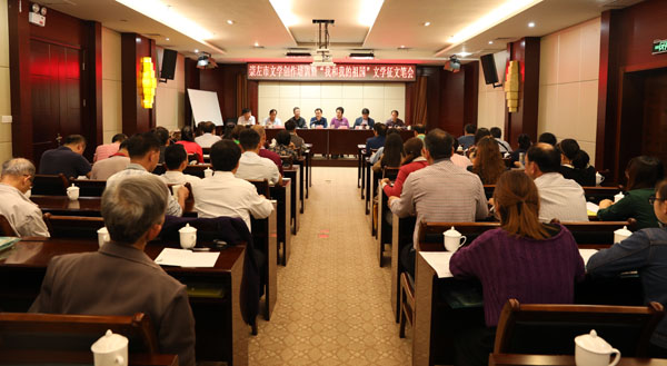 图为中共崇左市宣传部常务副部长阮立平(右二)在笔会上鼓励崇左本土作家多创作文学精品