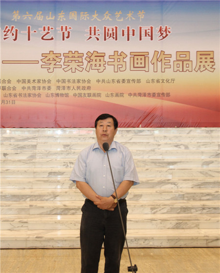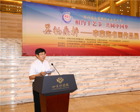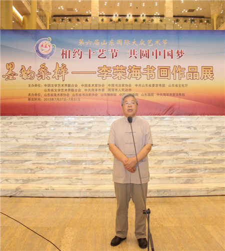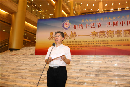 7月27日上午,由中国文联、中国美协、中国书协、中共山东省委宣传部、山东省文化厅、山东省文联、中共菏泽市委、菏泽市政府共同主办的“墨韵桑梓·李荣海书画作品展”在山东博物馆隆重开幕。本次展览作为第六届山东国际大众艺术节的重要活动之一,以“相约十艺节,共圆中国梦”为主题,旨在为即将在山东举办的第十届中国艺术节营造良好的文化气氛,丰富艺术节的内容。