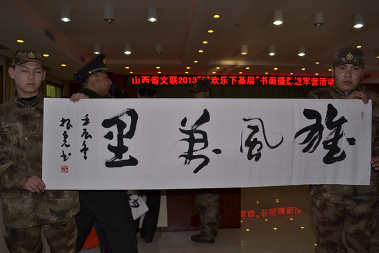 当一位战士拿到山西省政协常委、省文联党组书记、省书协副主席张根虎为他创作的“雄风万里”、“情韵书声”书法作品时喜悦之情难以抑制,感慨地说:“我平时也练习书法,今天能亲眼目睹这么多名家现场创作,并能得到张书记珍贵的墨迹,非常难得,我会好好学习和收藏这些作品。”