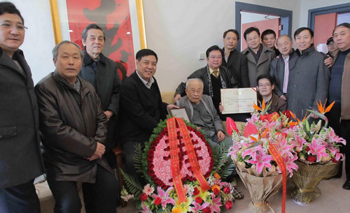 3月1日上午,在我国当代著名书画大家和美术教育家孙其峰先生迎来94岁华诞之际,天津市文联党组书记、秘书长孙福海,天津美院院长姜陆,天津市文联党组副书记寇士恺,天津画院党组书记张桂元,天津市文联党组成员、常务副秘书长商移山,天津市美协主席曹德兆,天津市书协主席唐云来,天津市文联副秘书长、天津市书协常务副主席张建会,天津市美协副主席兼秘书长王书平以及天津画院党组成员、副院长郭凤祥、范扬等有关方面负责同志前往看望和慰问,向刚刚荣获第二届“中国美术奖 终身成就奖”和此前荣获“中国书法兰亭奖?终身成就奖”两项国家大奖的孙先生表示祝贺。